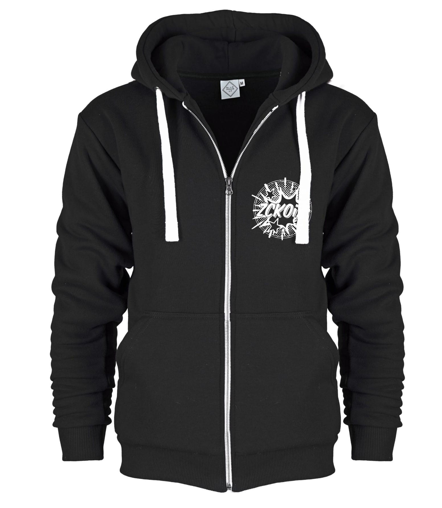 Rozpinana bluza z kapturem i kieszeniami. Cóż za wygoda. Logo szkoły wykonane na piersi.