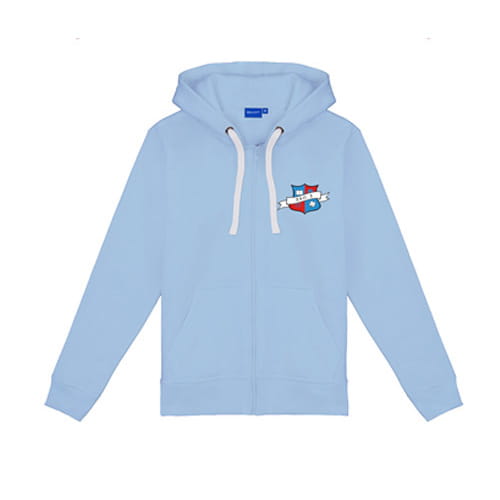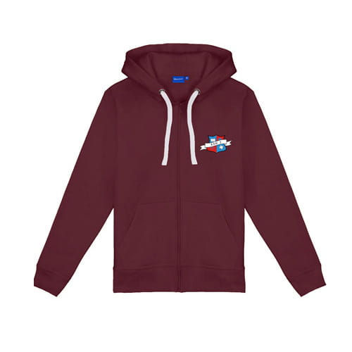 Rozpinana bluza z kapturem i kieszeniami. Cóż za wygoda. Logo szkoły wyhaftowane na piersi oraz napis na plecach.